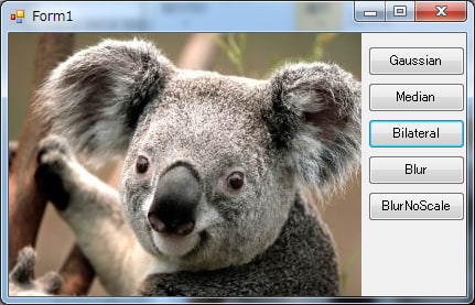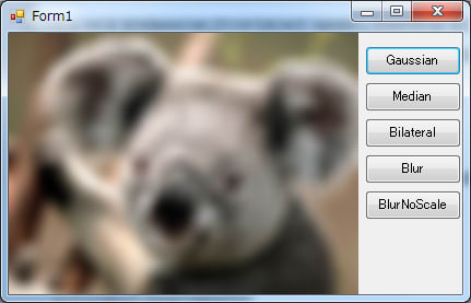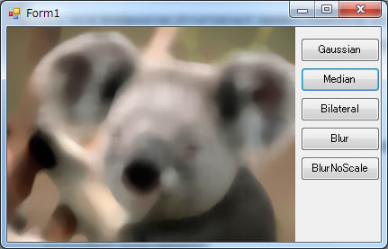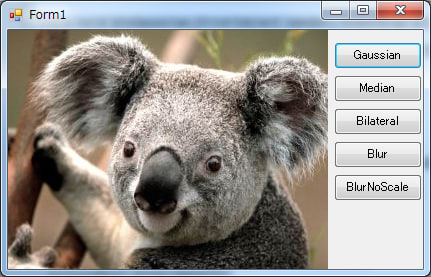 実験はGaussian Median Bilateral Blur BlurNoScaleの5つのボタンを準備し それぞれ対応する SmoothType メソッドを実行しました。簡単のため param1, param2, param3, param4 はほぼ同じ値にしてあります。